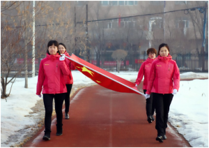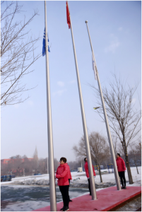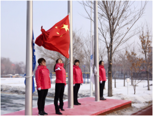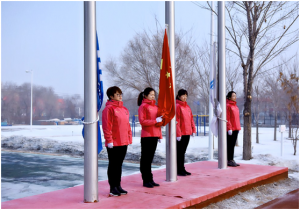 此刻升旗手精神格外振奋,他们迈着威武的步伐,坚定有力地走向升旗台,将鲜艳的五星红旗挂在旗杆上,伴随着庄严激昂的国歌声,鲜艳的五星红旗冉冉升起,在场全体员工,脱帽,向五星红旗行注目礼,齐唱国歌,胸中释放爱国主义豪情。